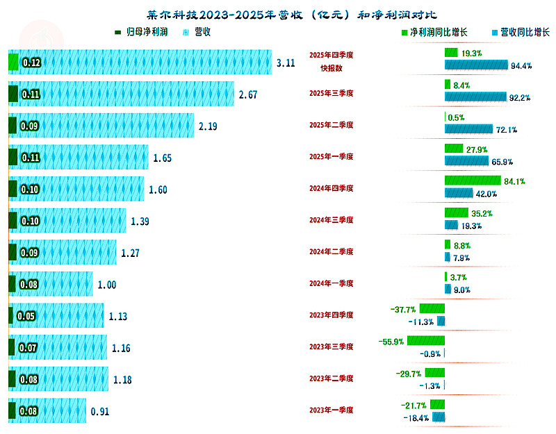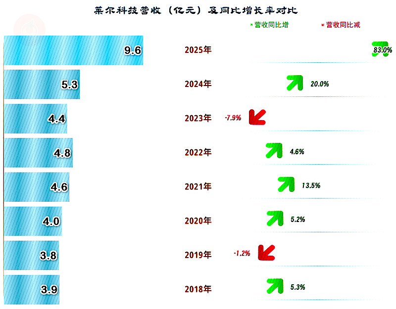 从业绩快报看,莱尔科技2025年的营收同比增长超八成,打破了前四年在5亿元左右徘徊的局面,取得了上市以来的最大增长,形势看起来不错。