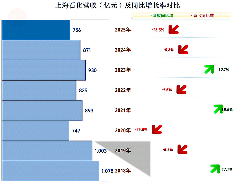 2025年,上海石化的营收同比下跌13.3%,是最近八年中仅高于2020年的表现。2020年是受疫情突然爆发的影响,2025年没有这些意外因素,还是出现了连续两年的营收下跌。