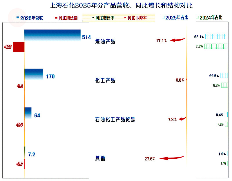 所有的业务都在下跌,核心的“炼油产品”下跌是关键,占比也跌破了七成;“化工产品”相对稳定,其他两大非核心业务也有不同程度的下跌。