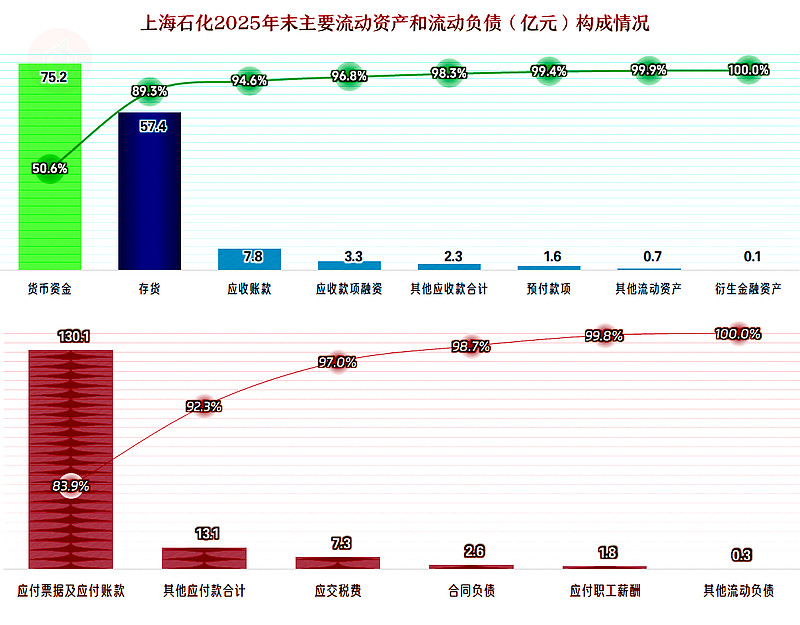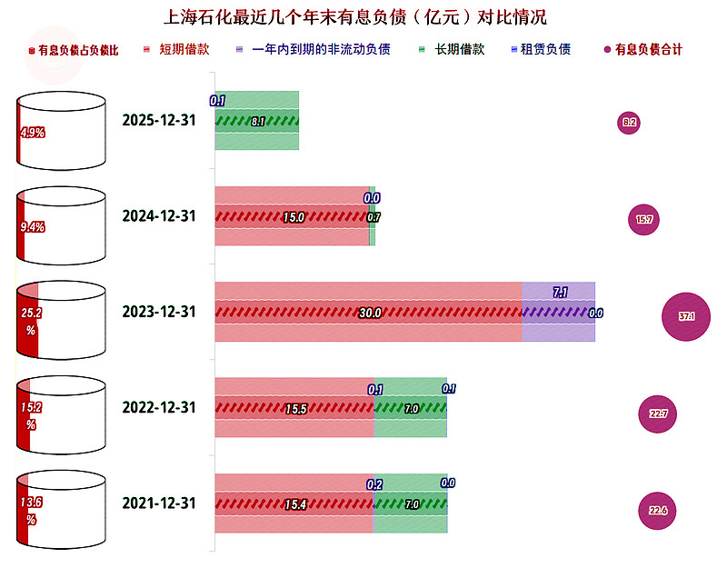 流动资产中占比过半的是货币资金,然后才是存货,其他项目的金额和占比相对较小,资产质量并不算差。流动负债当中几乎没有有息负债,主要是欠供应链上的款项,只要营收相对稳定,这方面是可以滚动支付的。从该情况看,上海石化的短期偿债能力其实是很强的,只是有点“欺负”供应商。