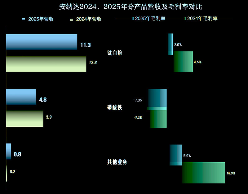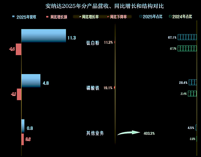 “钛白粉”和“磷酸铁”,这两大核心业务都在下跌,“磷酸铁”的跌幅接近两成,其他业务的大幅增长,多少起到了一定的抵消作用。