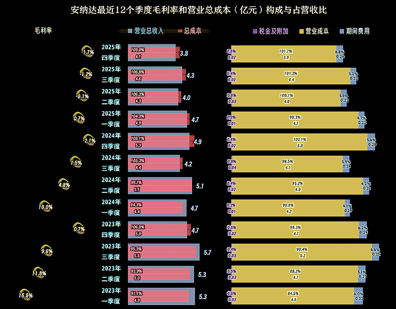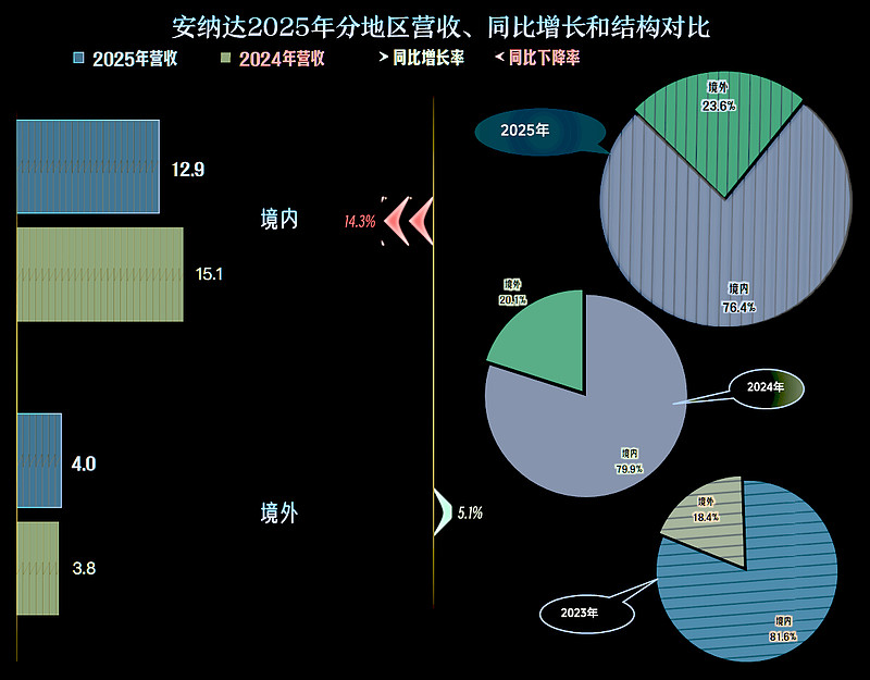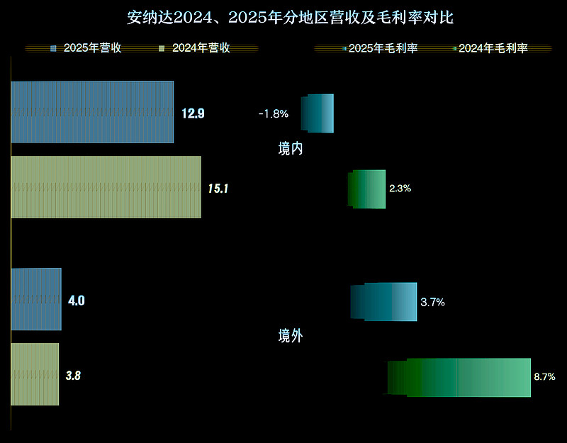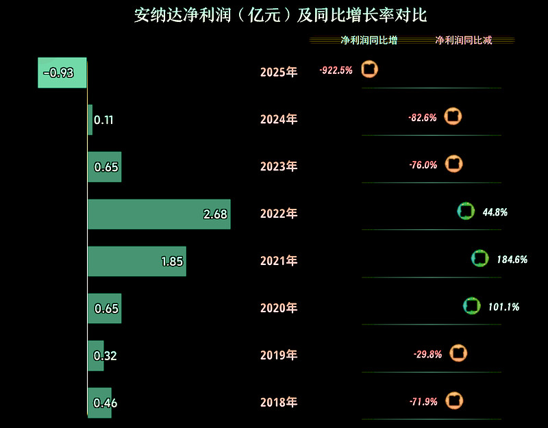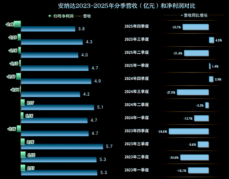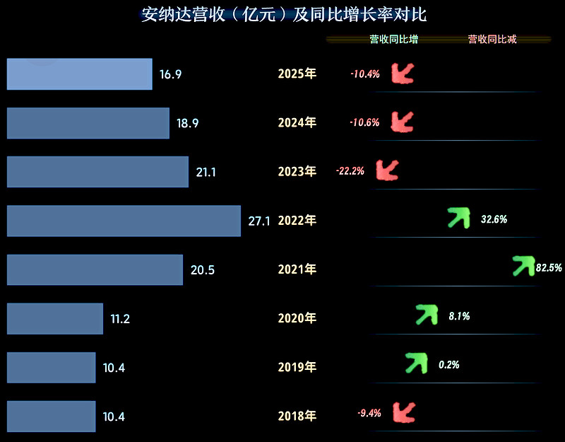 2025年,安纳达的营收同比下跌一成,和2024年的跌幅接近,这已经是连续三年下跌了,累计跌去了超10亿元。