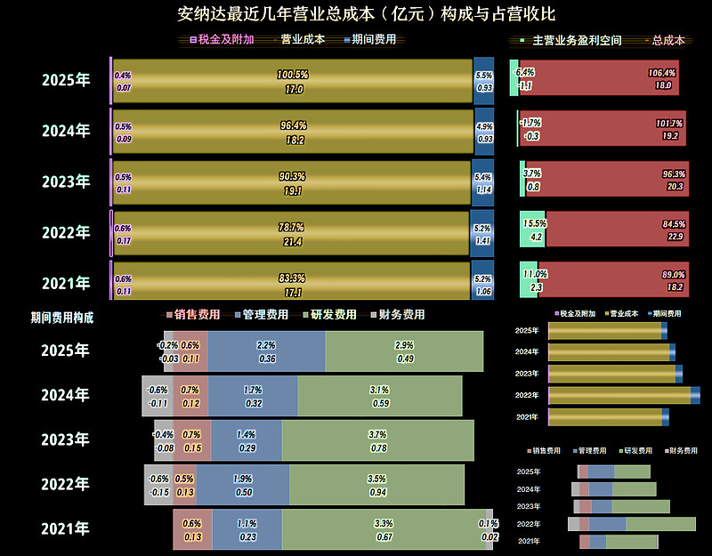 影响主营业务盈利空间的因素主要是毛利率的下跌,期间费用占营收比的影响很小。安纳达已经认识到严峻的经营形势,近三年都在持续压缩期间费用,基本上把这方面的影响给消除掉了。