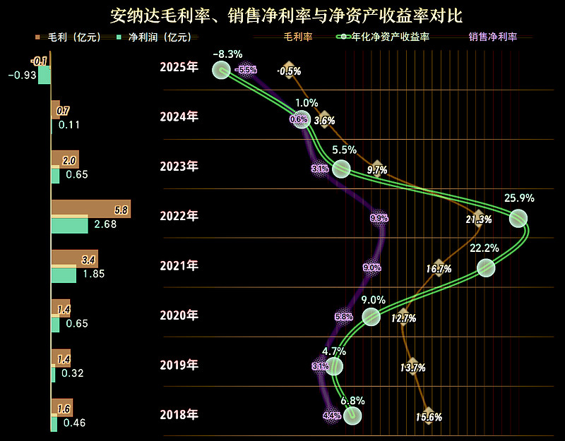 毛利率连续三年都在大幅下跌,2025年跌成负数,成为导致亏损的主要影响因素。2023年及以前,安纳达的销售净利率和净资产收益率都是优秀级的表现,特别是2021年和2022年还发出了“葵花宝典”(净资产收益率高于毛利率)绝招,最近两年当然就比较难看了。