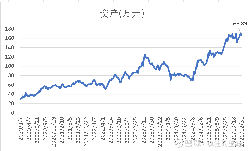 随着12月31日下午3点的到来,今年我示范账户的净值也最终确定了下来。为测试自己的体系和精确计算自己的收益率,我从2020年1月7日开始启动了一个封闭式的账户,并且立下了几点运行的规矩:资金不进不出、不加融资、不打新股、不独仓一只。几年运作下来,收益率分别如下:2020年88.14%,2021年23%,2022年10.27%,2023年31.91%,2024年4.57%,2025年58.05%,账户整体收益率为456.3%,目前这个账户的资产从30万元变成了166.89万元,年化收益率大概在33.5%,具体的净值曲线如下: