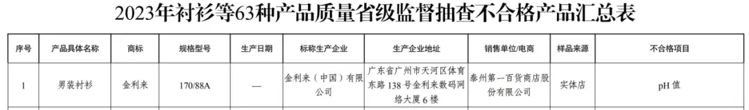 另外,2024年5月30日,江苏省市场监督管理局曾发布《关于2023年衬衫等83种产品质量省级监督抽查情况的通报》,其中第一款就是由金利来(中国)有限公司生产的规格为170/88A的金利来牌男装衬衫,不合格项目为PH值。