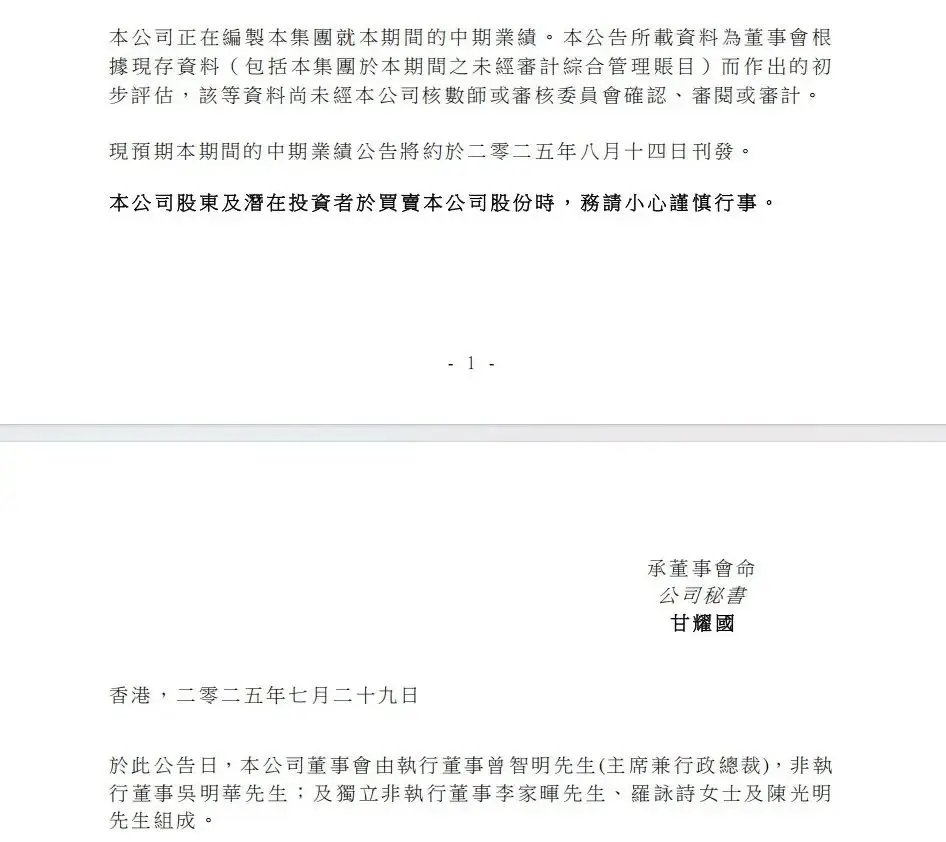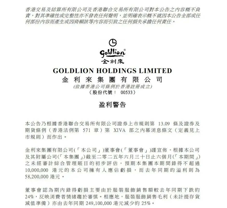 今年7月29日,金利来集团(以下简称“金利来”)发布《盈利警告》公告,宣布公司在截至2025年6月30日止的六个月内,预期将录得不超过1000万港元的公司拥有人应占亏损,而去年同期实现净利润5820万港元。