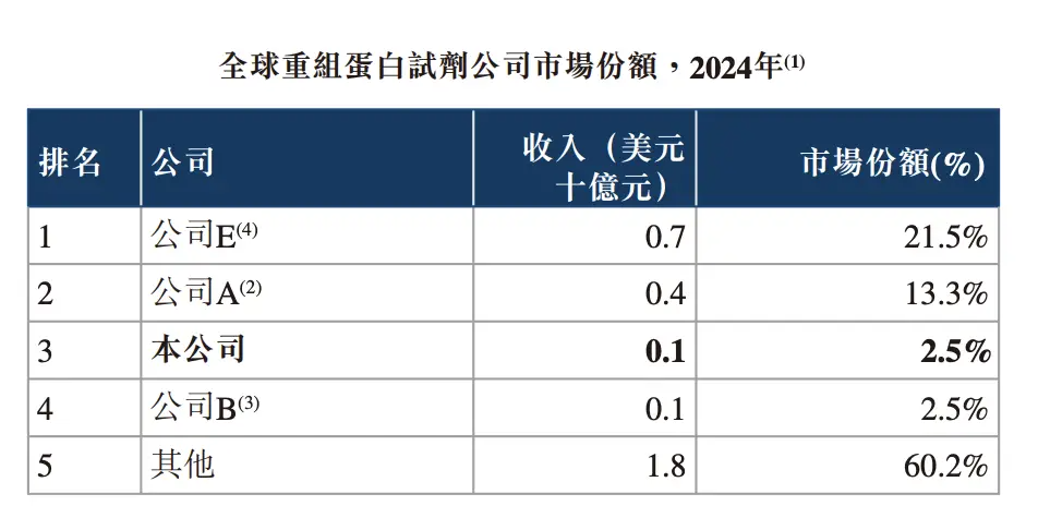 (图 / 百普赛斯港股招股书(公司E为Bio-Techne Corporation、公司A为赛默飞、公司B为德国默克))