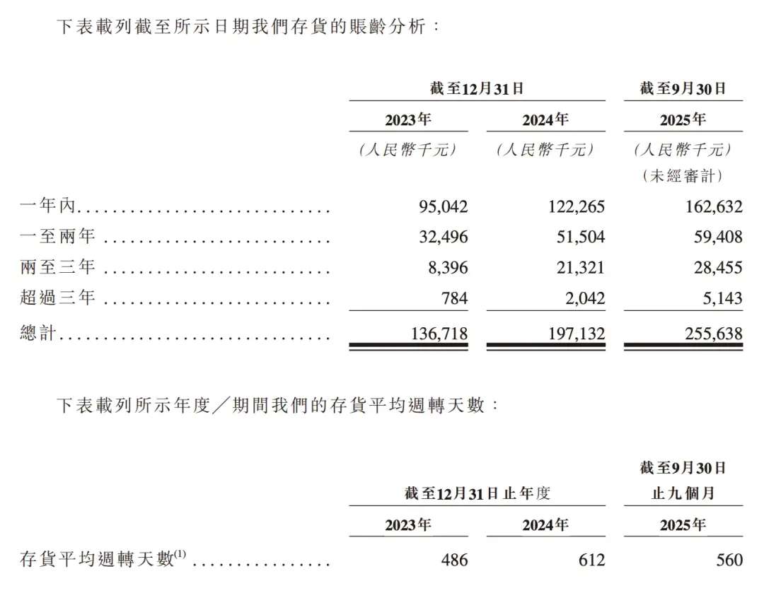 招股书显示,截至2025年三季度末,公司存货总量翻倍至2.56亿元,其中库龄超过一年的长周期存货占比从30.5%升至36.4%,两至三年及以上的老旧存货更是从2023年的900万元激增至3000万以上。