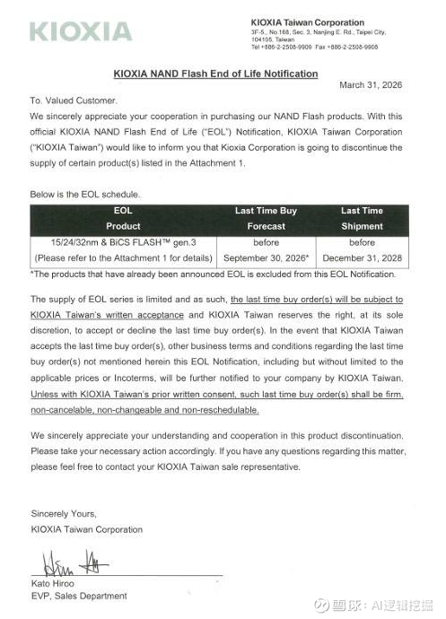 3月31日,NAND Flash大厂铠侠电子(中国)有限公司再度向客户发出通知,宣布将于2028年停止生产部分浮栅式(Floating Gate)和 BiCS Flash Gen3 产品。2D NAND的后续需求,普冉和兆易都有希望得到瓜分。
