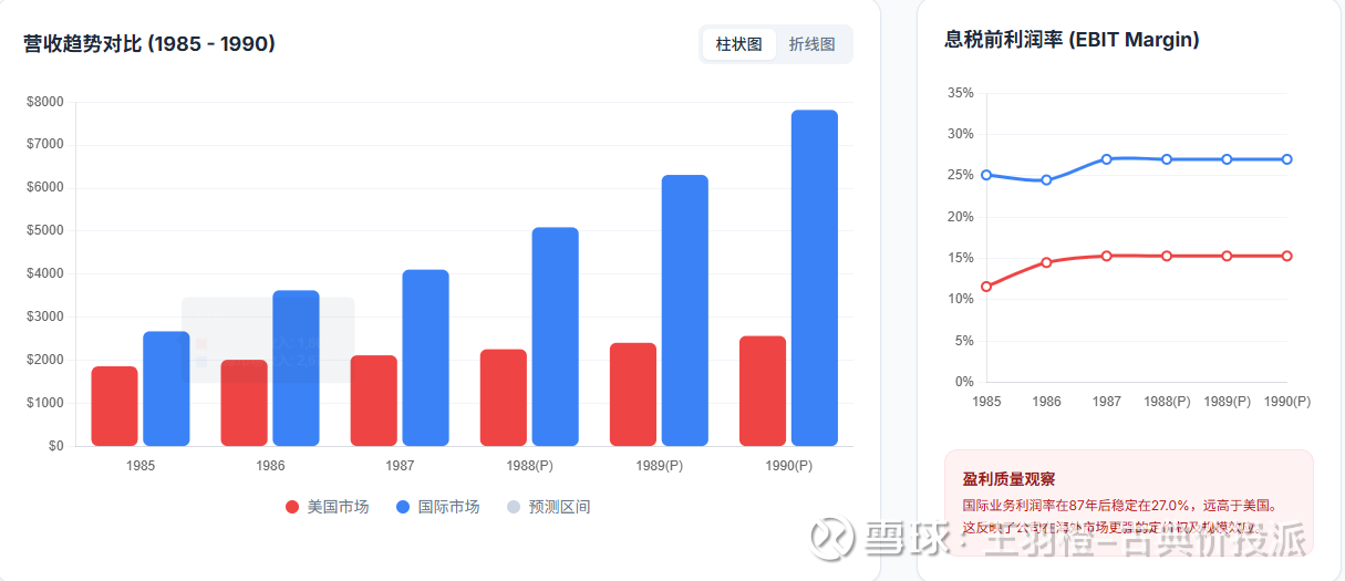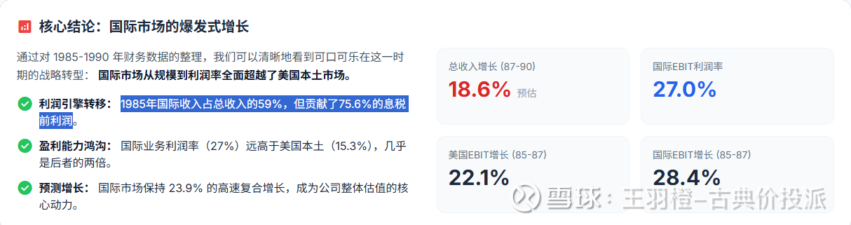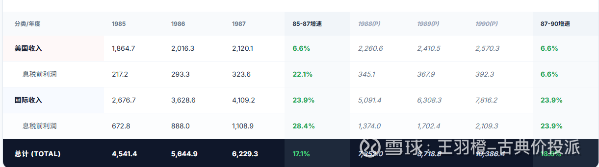 现在回顾巴菲特买入可口可乐的基本面背景,在上世纪80年代,可乐在美国的收入增长已经处于个位数,并且公司预测1987-1990未来几年的增长大概也就处在6.6%左右增速。但此时国际市场保持 23.9% 的高速复合增长,成为公司整体估值的核心动力。