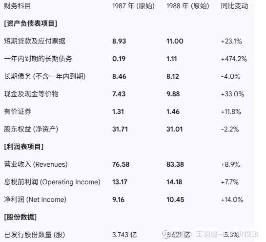 1988年是可口可乐历史上首次年度盈利超过 10 亿美元的年份。这一数字在当时全球企业利润排名中非常靠前。注意到 1987 年可口可乐的短期债务8.93亿略高于长期债务,到1988年超过长期债务约3亿。这并不是财务恶化,是因为当时老郭Goizueta正在利用公司极高的信用评级,通过发行更低成本的商业票据来优化资金成本。无论在1987还是1988年,现金+有价证券总计都足够覆盖短期债务,对于一家一年赚10亿的公司,很稳健不是。