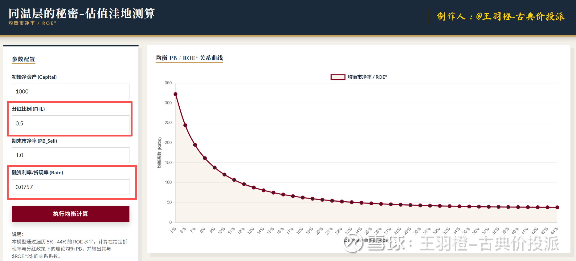 可以看到在利率7.57%,分红比例50%的前提下,股票的pb/roe^2理论上不会低于40(曲线最低值);