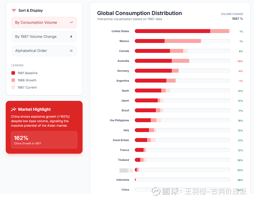 附上一张,1987年年报,可口可乐各大市场的消费情况