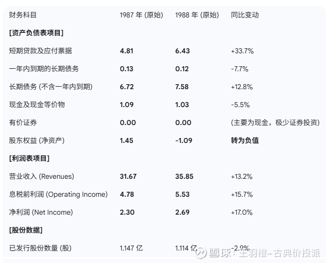 这是 1988 年吉列财务报表中最惊人的地方。为了防御恶意收购,吉列在 1988 年进行了一次被称为重组的动作,动用了大量借款回购了约 16% 的股份。巨额的回购支出直接冲减了所有者权益。