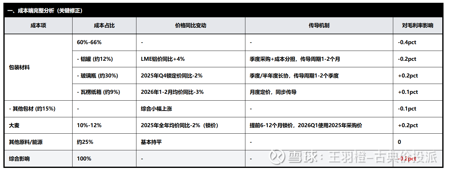 成本端:包装材料:铝价同比+4%,玻璃-2%,瓦楞纸-3%,综合影响约-0.4pct大麦:2025年全年均价同比-2%(锁价),贡献+0.2pct综合:毛利率同比基本持平或微降0.2个百分点。
