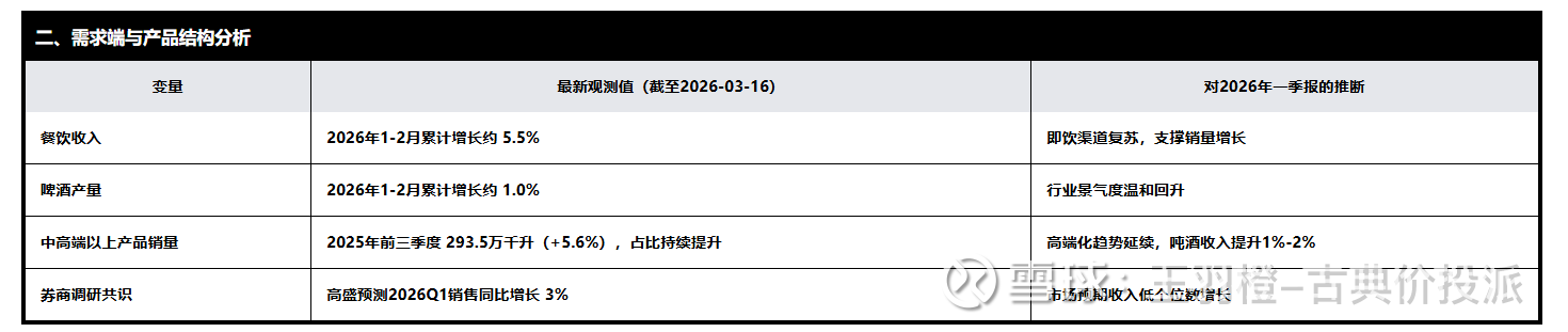 光成本低没用,得有人喝啊,来看看最新的干饭数据:餐饮收入 2026年1-2月,大家下馆子的热情不减,餐饮收入累计增长了5.5%!这就意味着,在烧烤摊、小龙虾店里,开一瓶青啤的概率大大增加了。啤酒产量 整个行业也挺争气,1-2月产量微增1.0%,说明啤酒这个赛道还是稳稳的。 高端化之路青啤的中高端产品比如白啤、原浆、经典1903卖得特别好。
