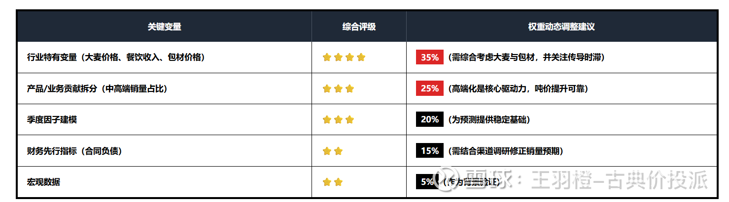 复盘历史业绩数据中每个因素对业绩的影响权重,包括行业特有变量(大麦价格、餐饮收入、包材价格)、产品/业务贡献拆分(中高端销量占比)、季度因子建模、财务先行指标(合同负债)、宏观数据