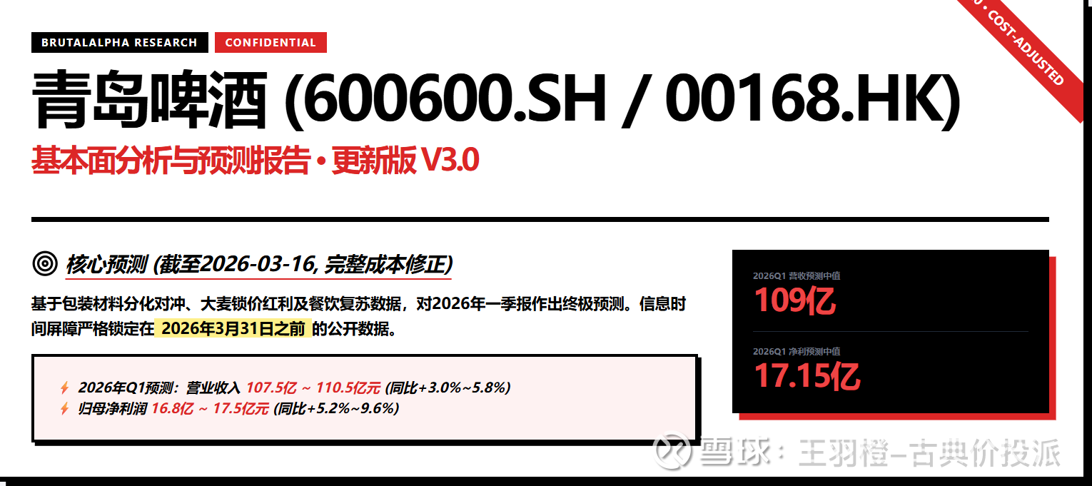 开坛作法,时间已经来到2026年3月中旬,很快,青岛啤酒2026年第一季度的成绩单也就是一季报就要揭晓了。作为一个合格的酒友兼股友,给青啤的一季报算一卦呗
