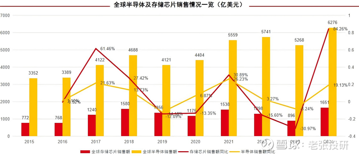 看组数据,2015年至2024年全球存储芯片销售额同比增速最高能接近90%,最低约为-31%,周期波动性远超半导体行业。
