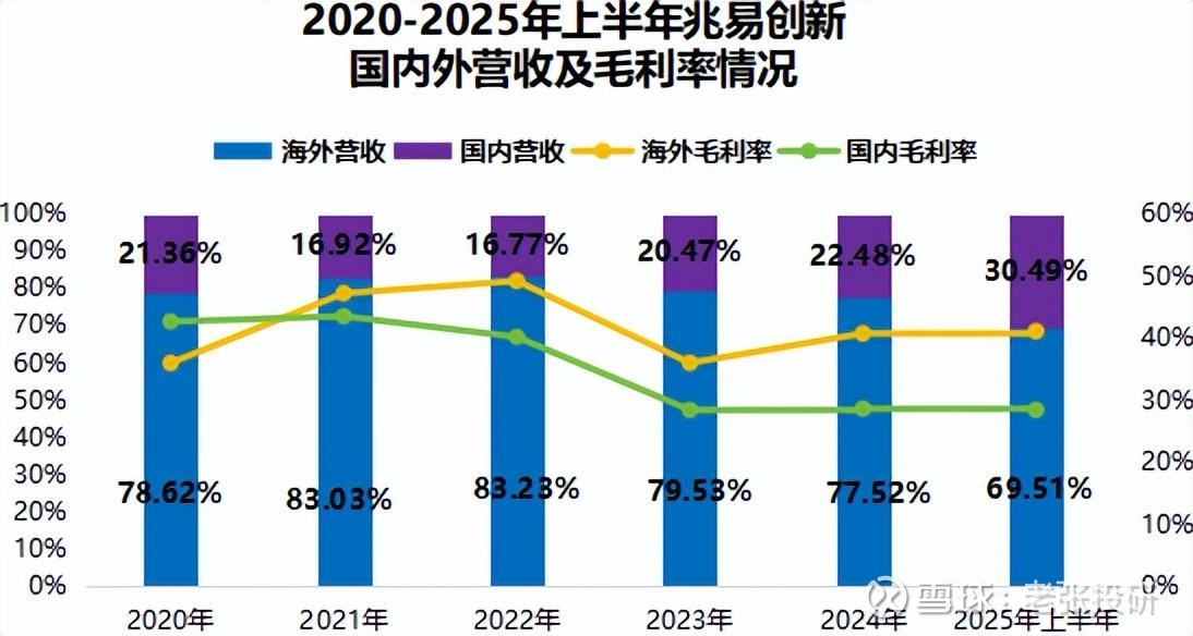 2022年到2025年上半年,兆易创新海外营收占比从83.23%逐渐下降至69.51%,同时,公司海外毛利率维持在40%附近,而2023年以来公司国内市场毛利率仅28%上下。