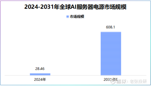 2024年全球AI服务器电源市场规模为28.46亿美元,预计到2031年将增长至608.1亿美元,年复合增长率约55%。