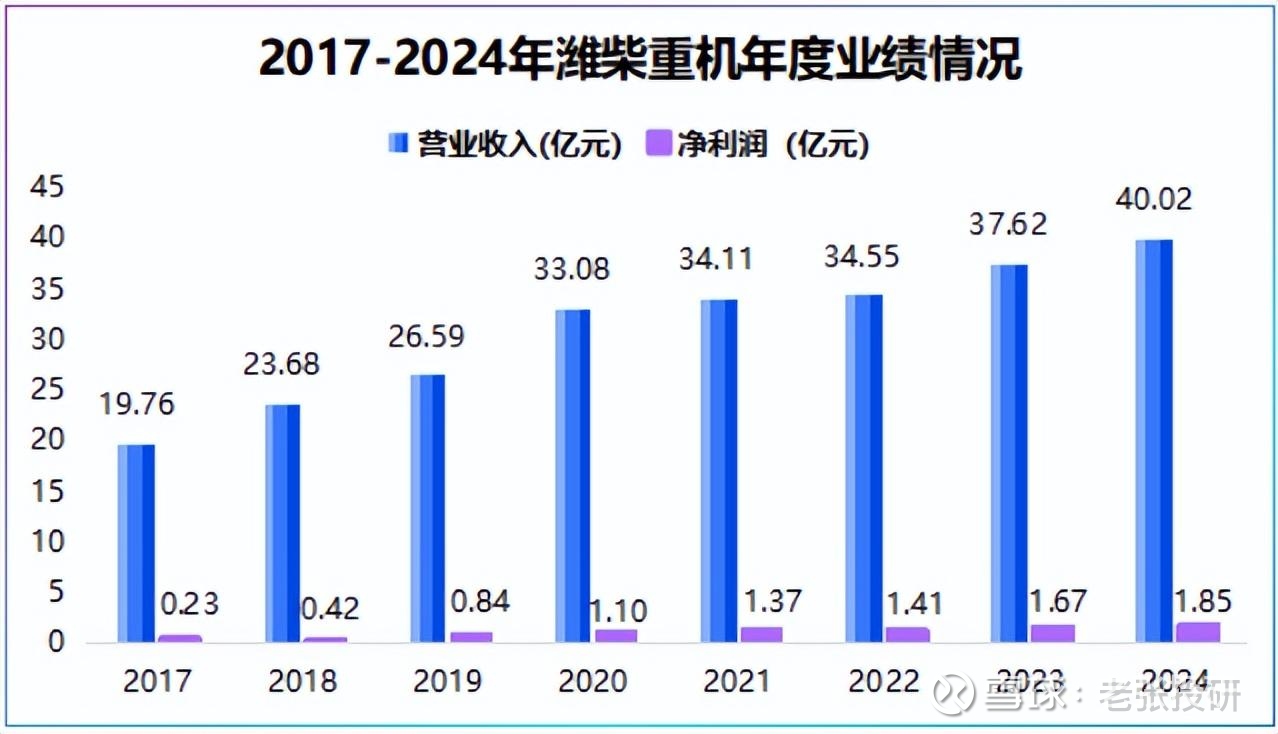 所以,潍柴重机成长更稳,数据显示,公司营收从2017年的19.76亿元增长至2024年40.02亿元,年复合增速为10.61%。