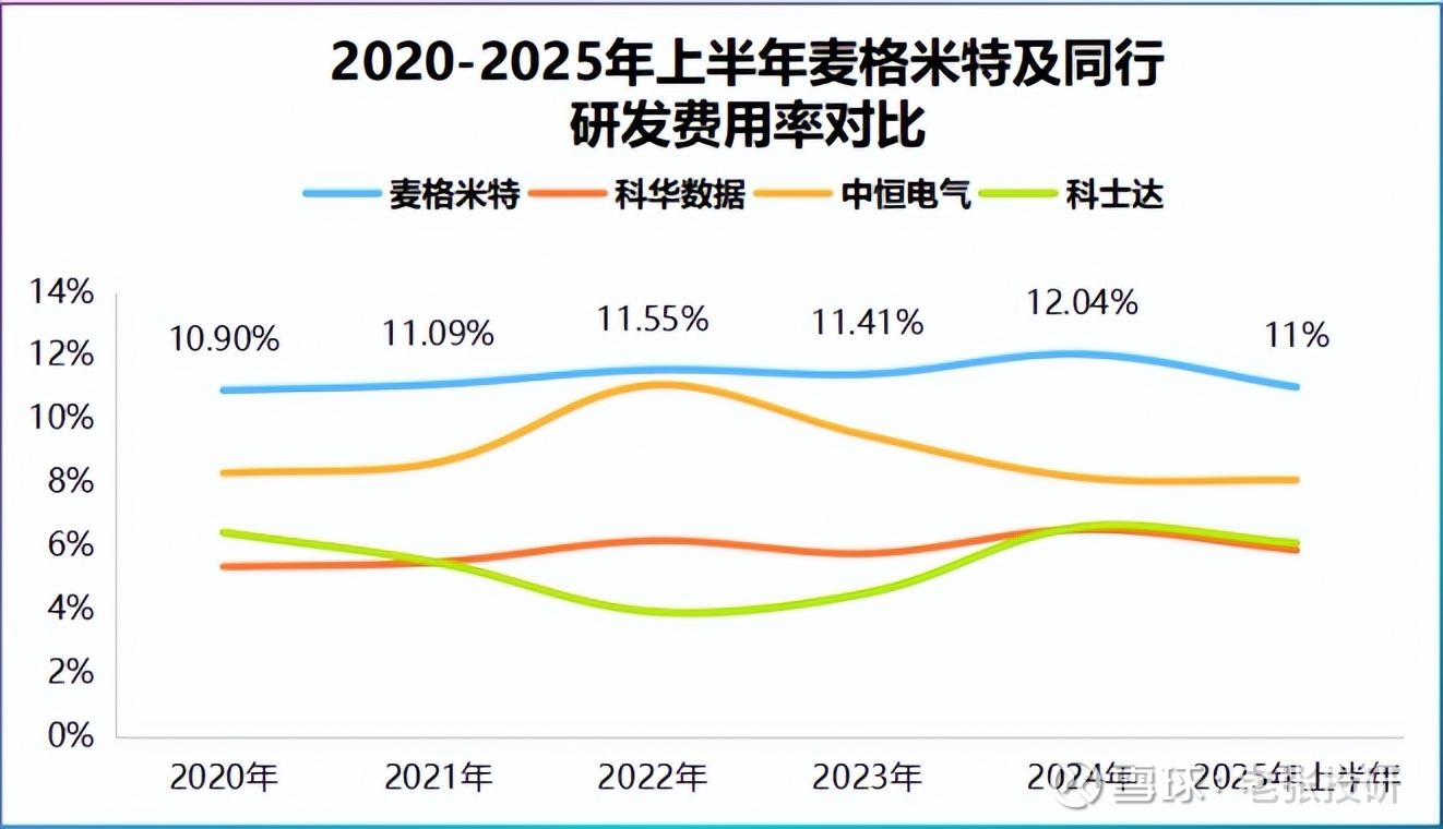 数据显示,2020年以来公司研发费用率从10.9%直线上升至2024年12.04%,2025年上半年依旧保持在11%的高水平,成了同行内最特殊的存在。