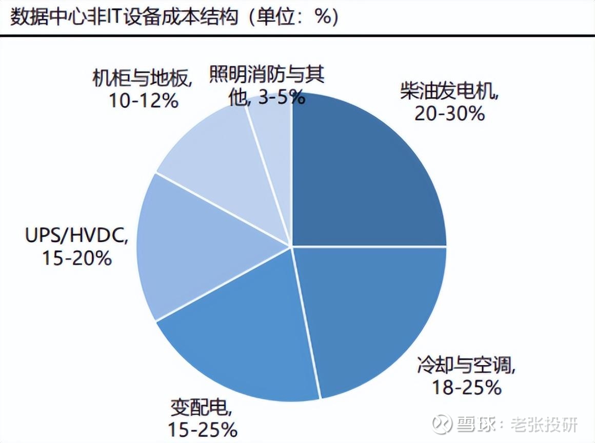 柴油发电机、变配电以及UPS(不间断电源)/HVDC(高压直流电源)占数据中心非IT成本的比例可达60%以上!