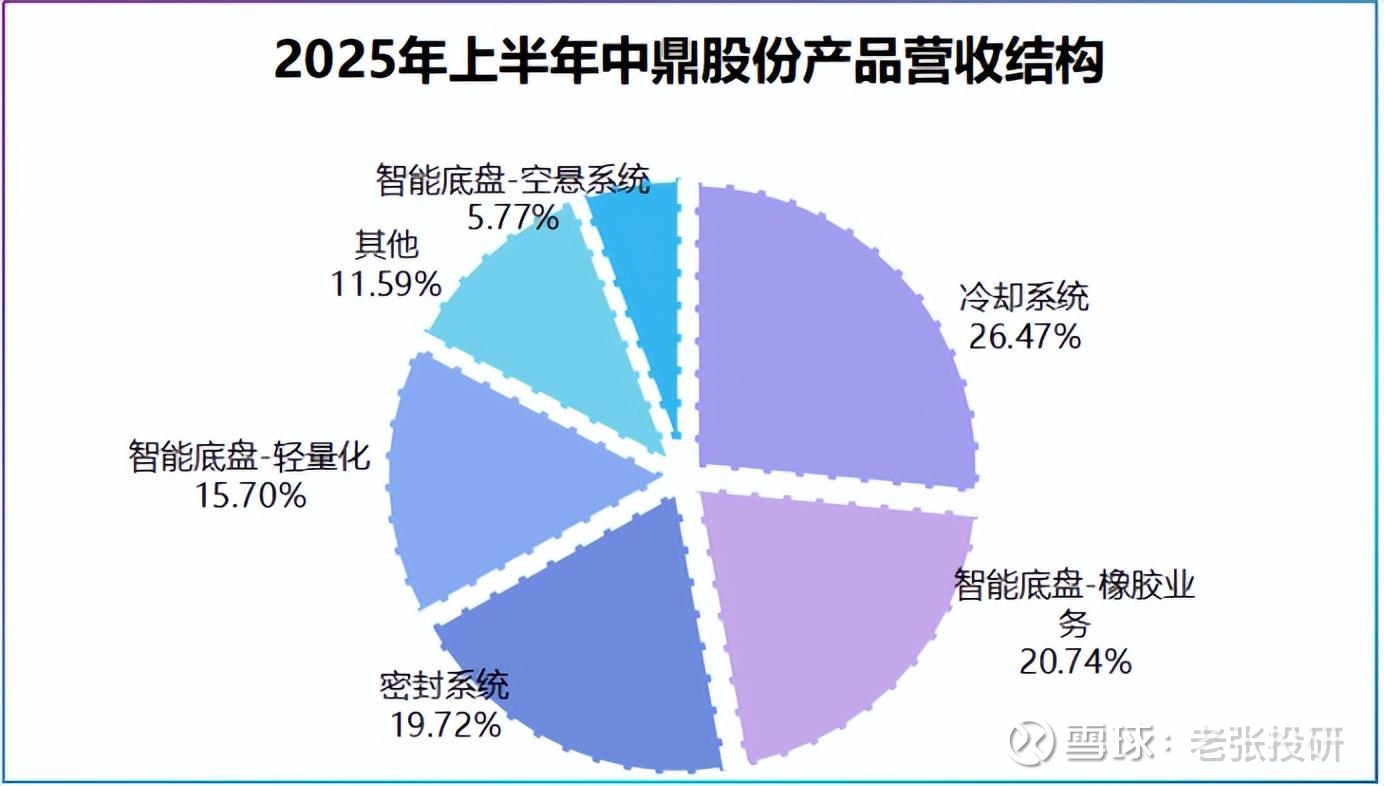 业务结构上,中鼎股份覆盖汽车冷却系统、智能底盘以及密封系统,2025年上半年营收占比分别为26.47%、42.21%和19.72%。