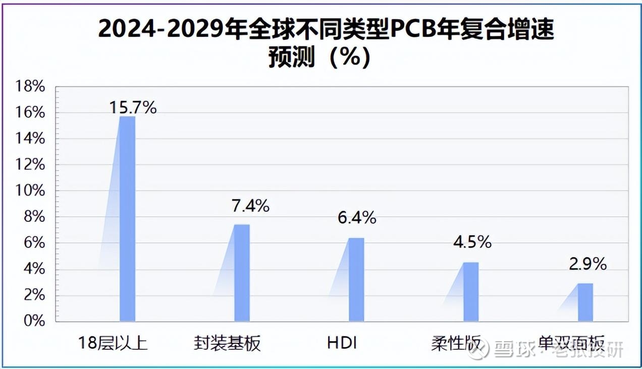 数据说话,封装基板、HDI以及18层以上多层板未来增速不慢,预计2024-2029年18层以上多层板全球产值将以15.7%的年复合增速增长,HDI板年复合增速约6.4%。