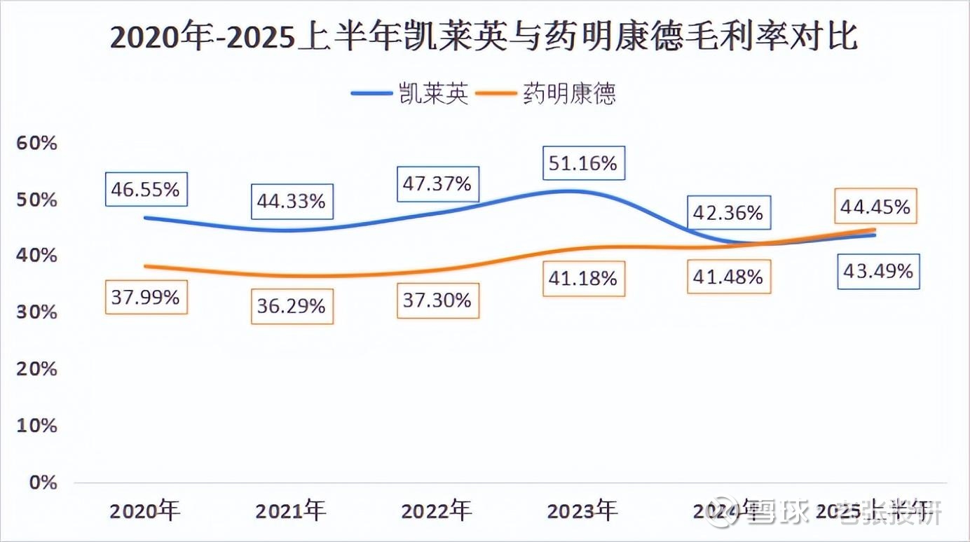 数据显示,2020年-2024年,凯莱英的毛利率始终高于药明康德,直至2025上半年才被追上,不分伯仲。