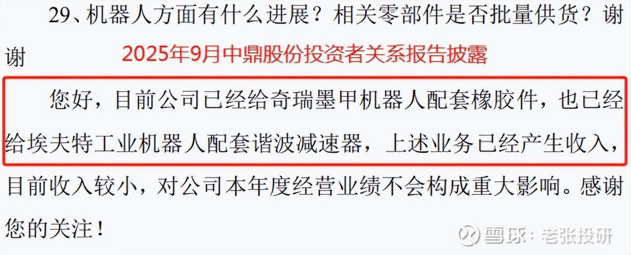 进一步具体来看,在9月份的一则公告中,中鼎股份表示,机器人业务已经产生收入,成功给奇瑞、埃夫特供货。