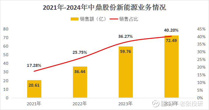 数据显示,2021年-2024年,公司新能源销售额从20.61亿一路增长至72.49亿,占比从17.28%提升至40.20%。