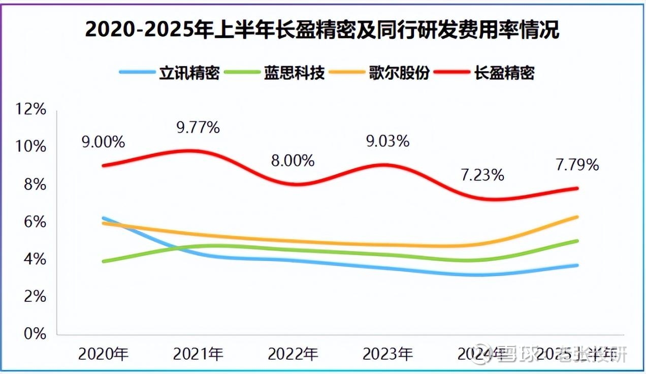 财报显示,2020-2024年长盈精密累计研发费用接近65亿元,平均研发费用率为8.6%,高于立讯精密(4.24%)、歌尔股份(5.17%)。