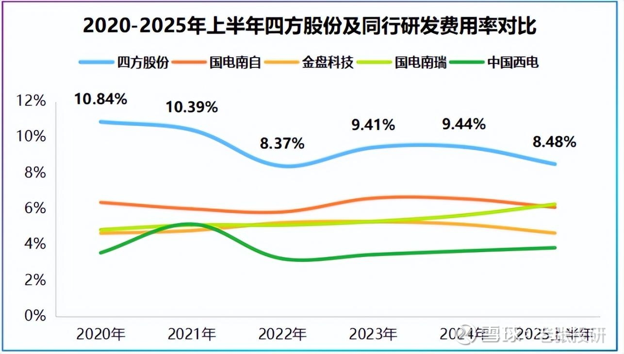 反映到研发支出上,2020-2024年四方股份累计研发费用约25亿元,年均研发费用率接近10%,而同行多处于3%~6%上下。