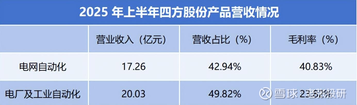 透过四方股份产品结构图,可以清晰地看到公司支柱业务为电网自动化与电厂及工业自动化两部分,2025年上半年营收占比分别为42.94%、49.82%。