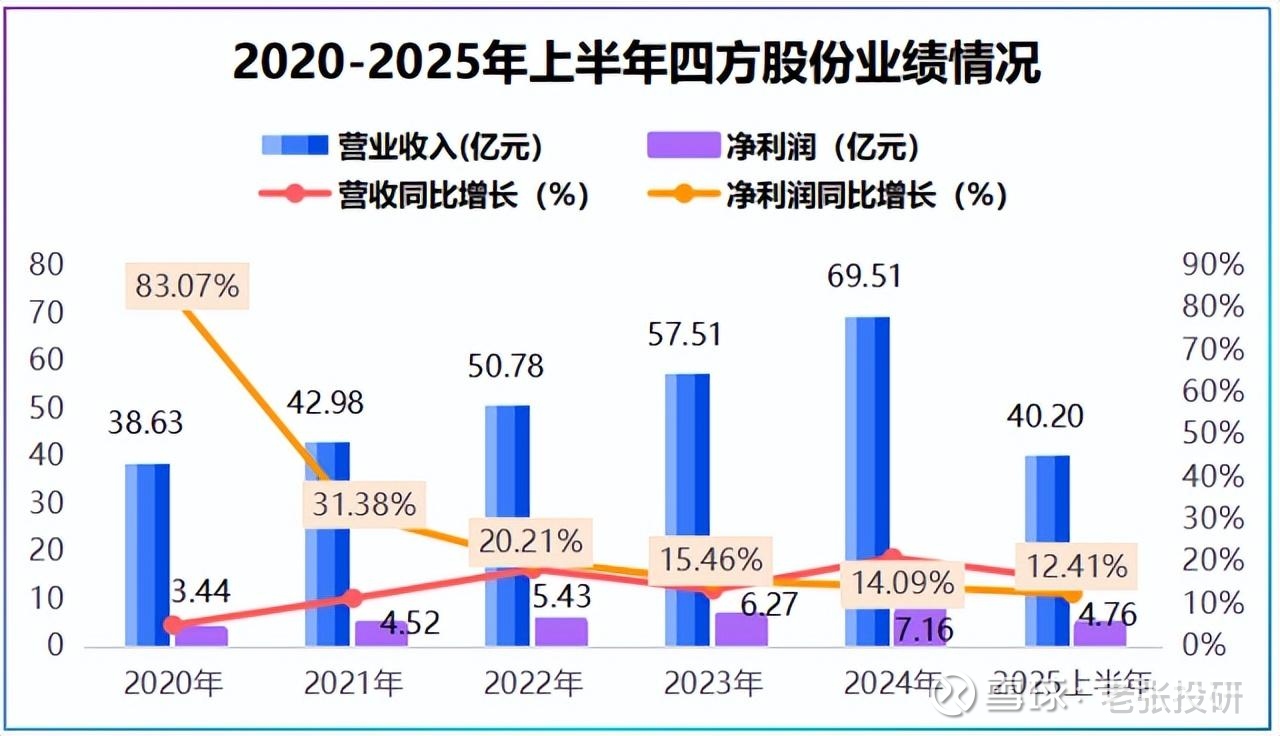 2020-2024年,四方股份营收从2020年的38.63亿元增长至2024年的69.51亿元,年均复合增长率为15.82%,同期净利润年均复合增速为20.1%。