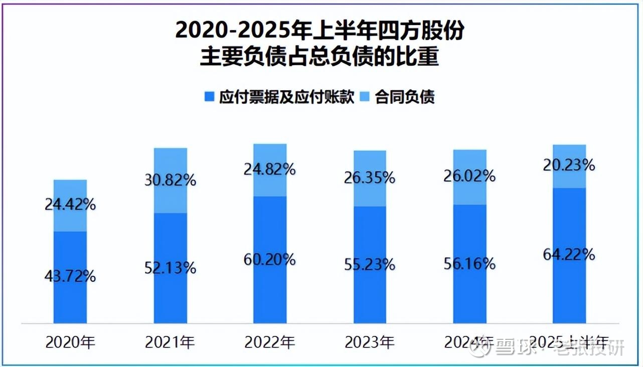 更进一步看,四方股份负债主要由应付账款与合同负债构成,2025年上半年二者占公司总负债的比重分别为62.44%、20.23%,应付账款规模显著高于应收账款。