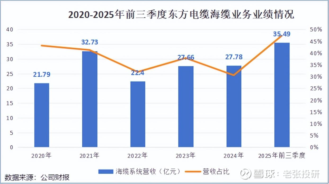 在这一背景下,2025年前三季度东方电缆的海缆业务实现营收35.49亿元,营收占比高达47.33%,远超去年全年水平。