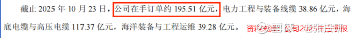 截至2025年10月23日,东方电缆的在手订单约为195.51亿元。