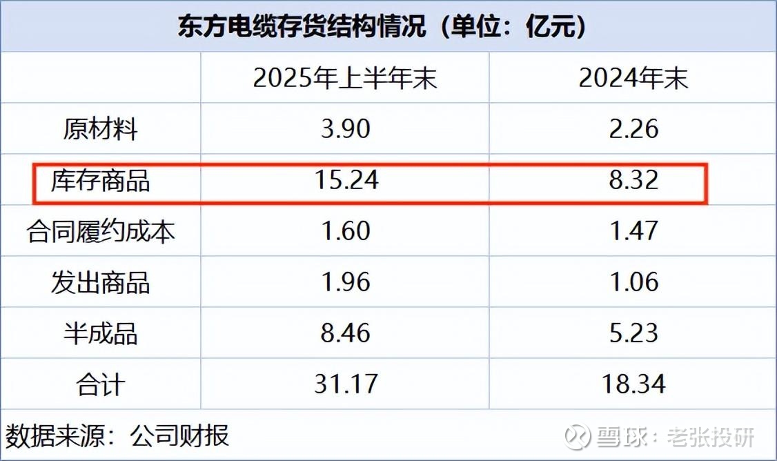 数据显示,2025年上半年,东方电缆存货中的“库存商品”从年初的8.32亿元迅速攀升至15.24亿元,增幅接近100%。更关键的是,库存商品在存货中的占比接近50%。