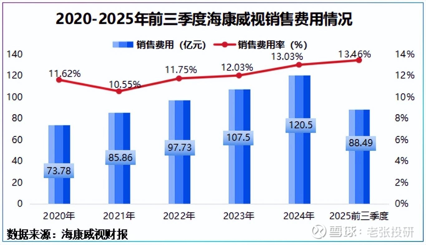 2020年海康威视销售费用为73.78亿元,销售费用率为11.62%,但到了2024年其销售费用高达120.5亿元,销售费用率提高到了13.03%,算上2025年前三季度累计投入约574亿元。
