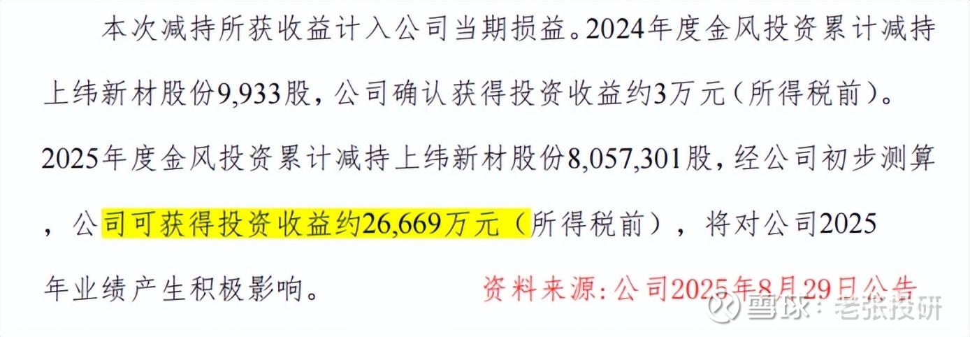金风科技公告显示,2025年1月到8月28日,金风投资年内减持上纬新材的交易金额约3.21亿元,公司可获得投资收益约2.67亿元。