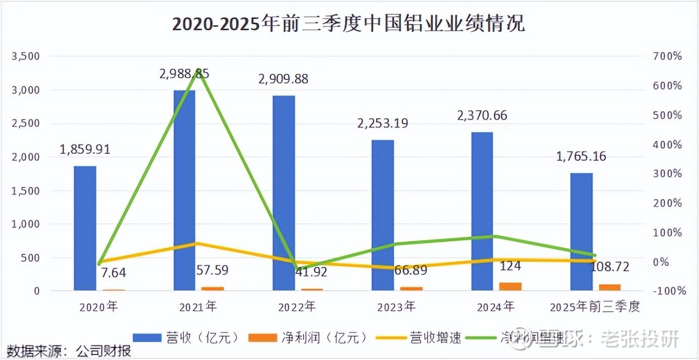 2020-2025年前三季度,中国铝业的毛利率由8.24%大幅提升至17.31%,净利率也从0.85%增至9.8%。