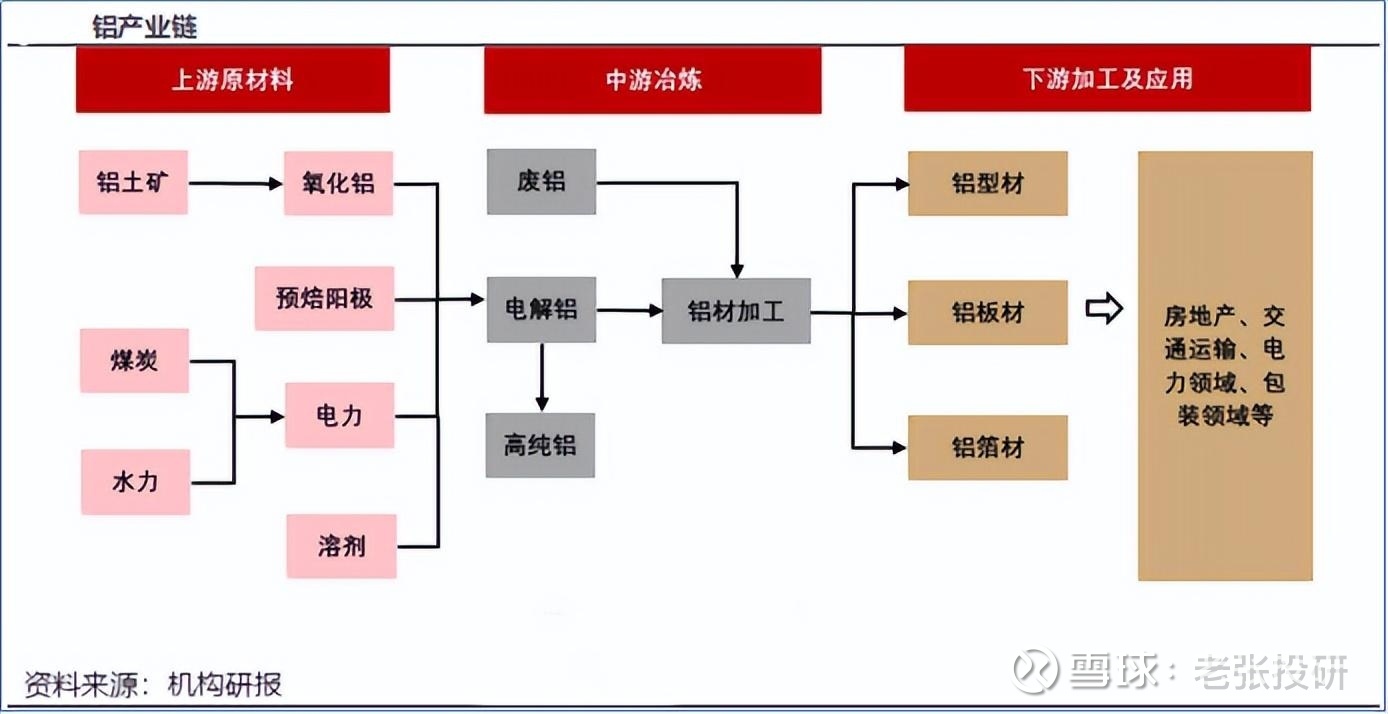 在下游加工端,铝锭、铝基合金等产品被输送到房地产、交通运输、电力、包装等行业。