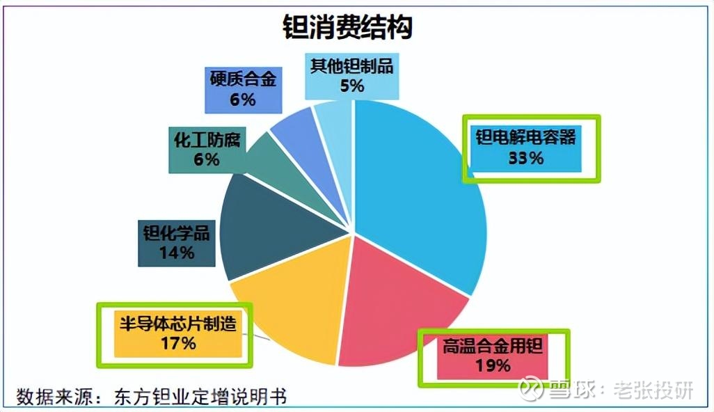 全球钽需求高度集中在钽电容器、高温合金用钽与半导体芯片制造,占比分别为33%、19%和17%,合计达69%。