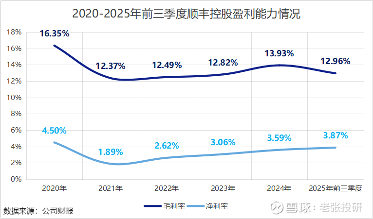 2020-2025年前三季度,顺丰控股的毛利率从16.35%下降至12.96%,净利率从4.5%下降至3.87%。