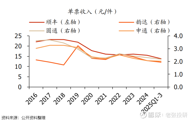 2019年以前,顺丰控股的物流单票收入一直高于20元/件;而到了2025年前三季度,这一数字已下降至13.8元/件。不仅如此,圆通、韵达等同行物流单票收入也出现明显下降。