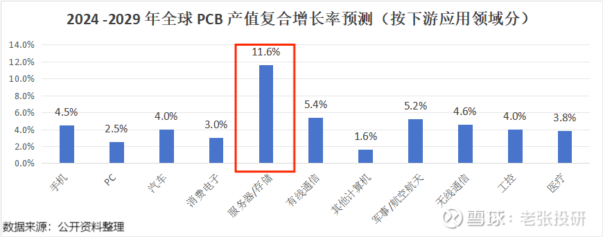 据预测,用于AI服务器、存储领域的PCB在2024-2029年的复合增速为11.6%,成为增速最快的细分应用领域。